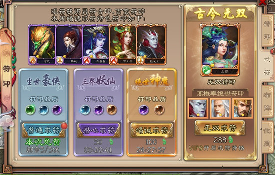 经历过“尘世豪侠”的小兵助力,感受过“三界妖仙”的给力紫符,惊讶于“绝世神魔”的顶级橙符。如今,《西游神魔决》再次带来激动人心的顶级福利,全新专属神级抽卡“古今无双”,100%高概率绝世符印,高顶级VIP的专属抽卡,你值得拥有。新的“古今无双”抽风卡模式分为整卡抽取和碎片抽取。碎片随机数量比起其他三种抽卡模式,将会大幅度的增加,合成高级符印唾手可得。