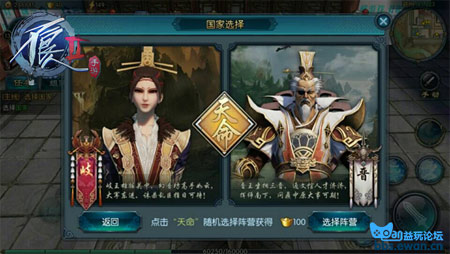 玩家在等级达到一定等级后,通过引导任务可选择加入国家,这个时候玩家可以选择自己喜欢的国家加入或使用天命所归功能随机选择(注意:国家一经选择后不可更改)