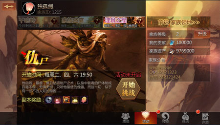 同时,家族族长也可以强化家族技能!每次每条属性都强化一次后,技能整体的等级才会增加,当一个技能满级后机会开启下一个技能,每个家族的技能都是4种,分为:强健、致命、利刃、坚甲;每个技能满级为10级!根据需要“使用”的技能不同,所需兑换的两日活跃数也不同,活跃表示大侠这两日的贡献值!