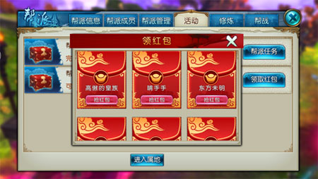 符合红包发送规则的情况下,可在“帮派聊天窗口“和“帮派界面—活动“发送红包符合红包领取规则的情况下,可在“帮派聊天窗口“和“帮派界面—活动“领取红包领取红包后可查看领取记录。