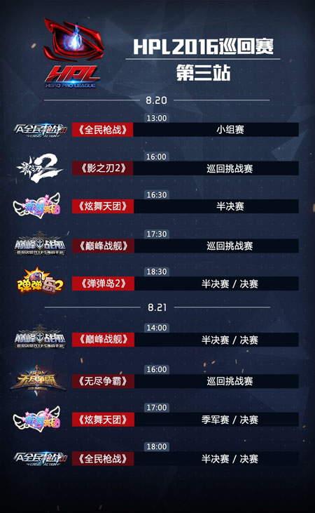 时隔一个多月,HPL巡回赛战火重燃,第三站比赛于2016年8月20日下午13:00正式开战。本次比赛依然会有来自《炫舞天团》、《全民枪战》、《巅峰战舰》、《弹弹岛2》四个项目的20支强队汇聚上海Nice TV Studio演播厅的舞台上为冠军之梦发起冲击。同时,比赛现场还会上演精彩的《影之刃2》与《无尽争霸》的表演赛。除去《全民枪战》项目冠军奖金依然是100000万元外,《巅峰战舰》项目的冠军奖金增加到了66000元。